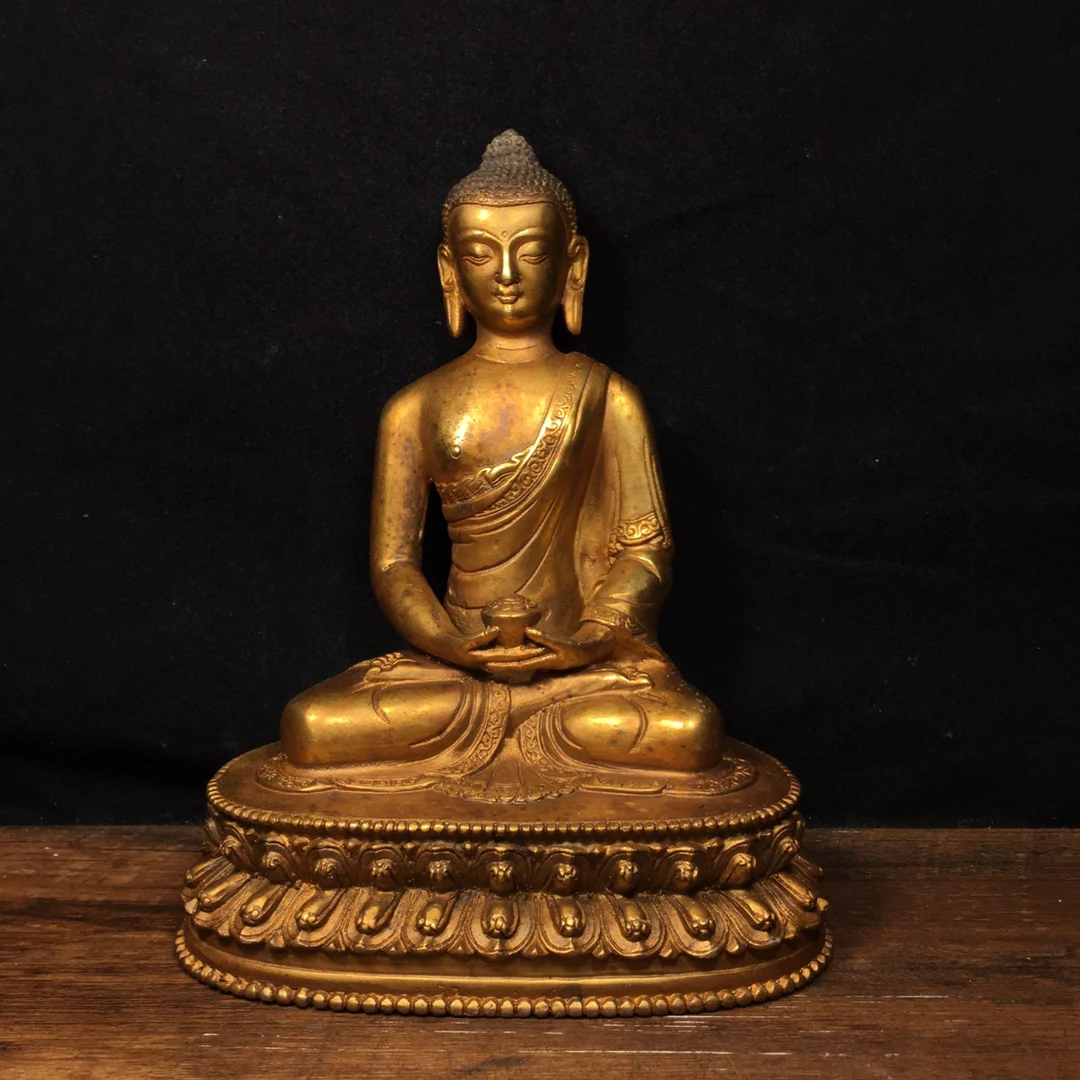 Коллекция тибетских храмов 8 дюймов, старинная бронзовая позолоченная Тройная драгоценность, Женская Платформа с лотосом Шакьямуни, семейн...