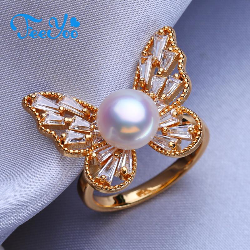 Кольца FEEYOO с натуральным пресноводным жемчугом для женщин и девочек, модное золотого цвета, регулируемый размер, кольцо-бабочка, подарок на день рождения