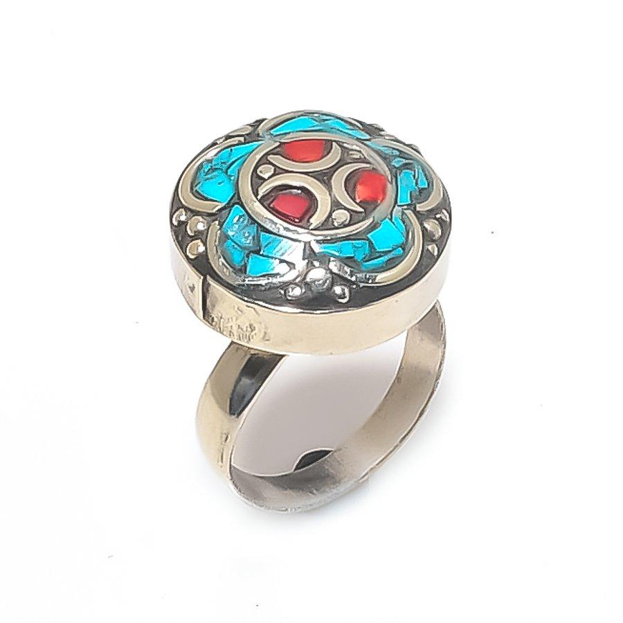 Кольцо из натурального тибетского бирюзового, кораллового серебра 925 пробы, размер регулируется G8m90