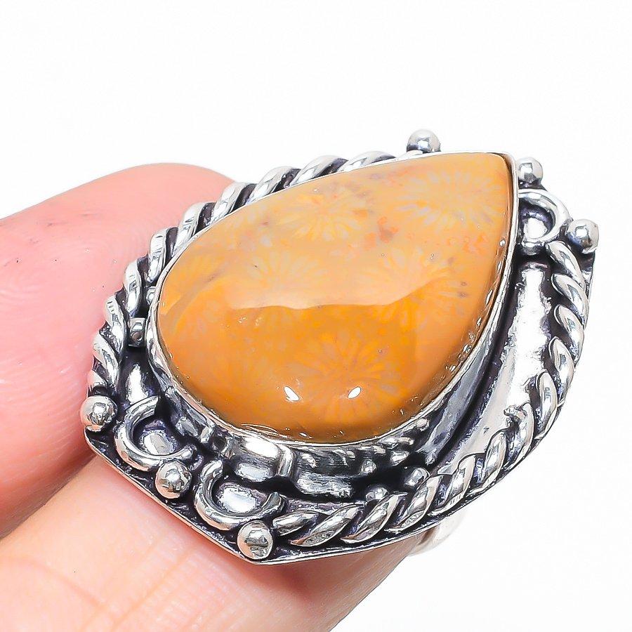 Кольцо из стерлингового серебра 925 пробы с натуральным ископаемым кораллом ручной работы, размер 6,5 v5G60