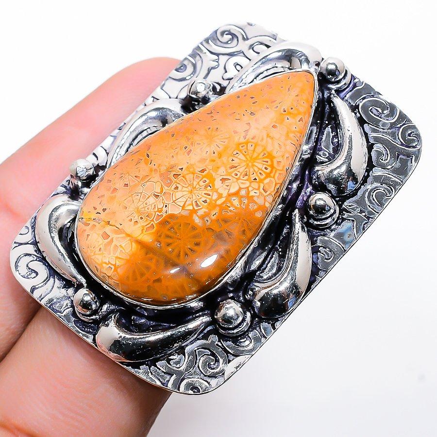 Кольцо из стерлингового серебра 925 пробы с натуральным ископаемым кораллом ручной работы, размер 9,5 I7n14