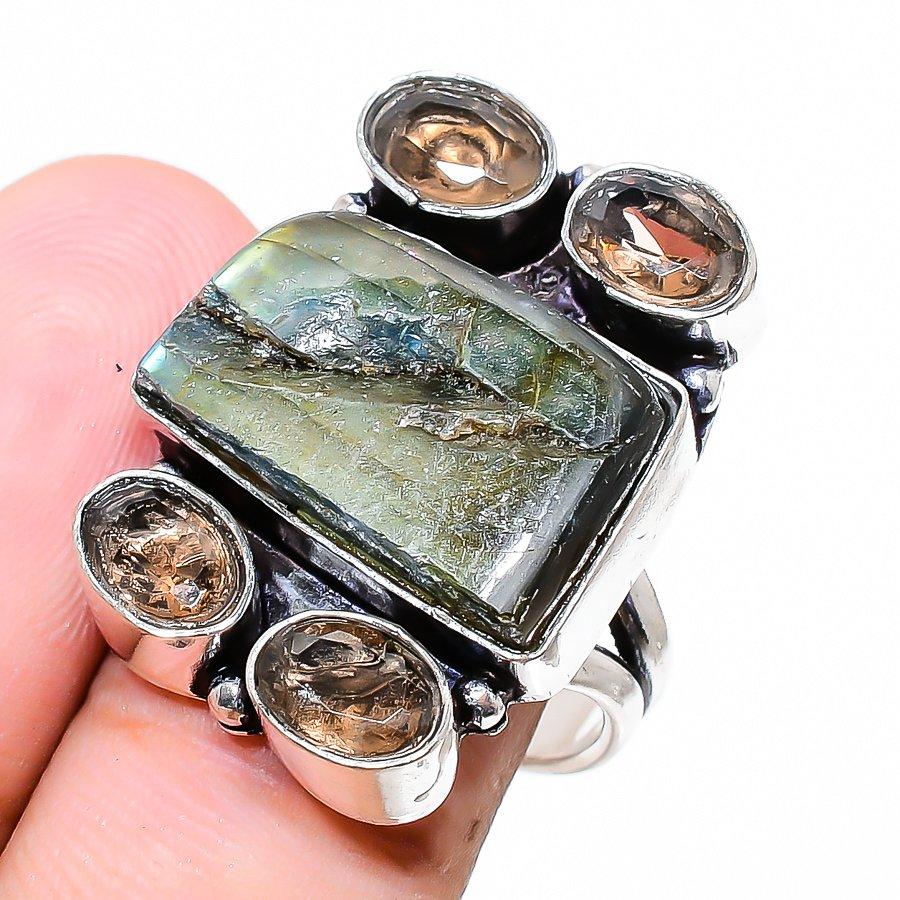 Кольцо из стерлингового серебра 925 пробы с натуральным лабрадоритом и топазом, размер 7 m4S21