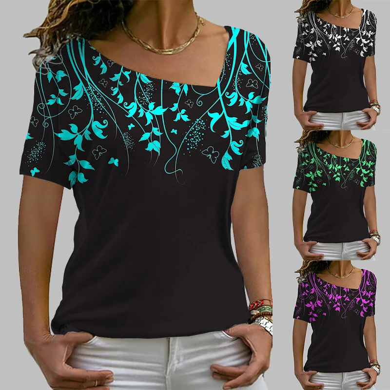 2022 Women's Vines Printed Patchwork Short Sleeve T-shirts Basic Tops XS-8XL