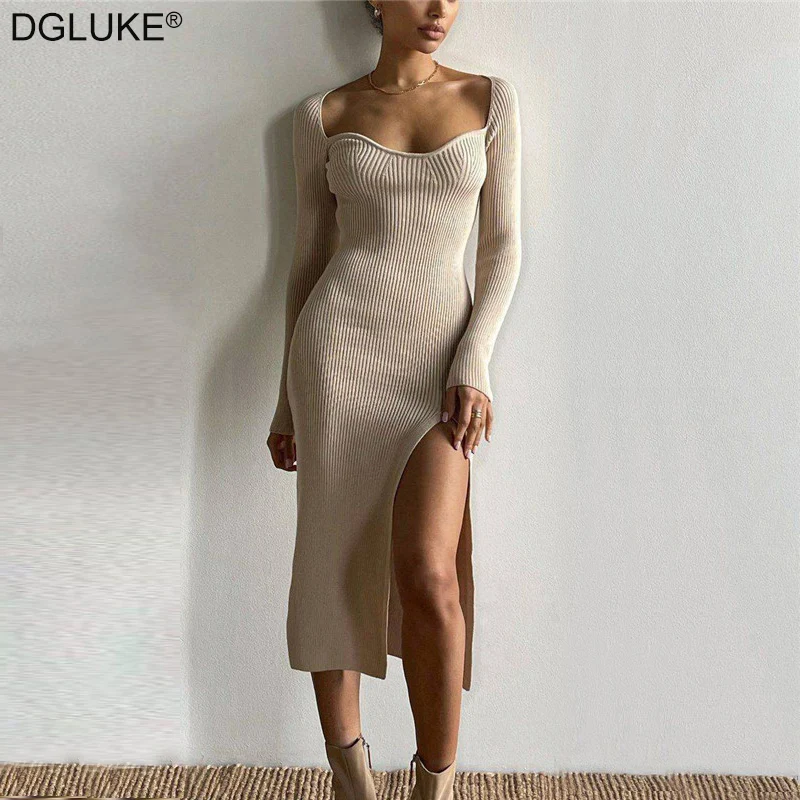Vintage Square Collar Long Knitted Dress Woman Autumn Winter Ribbed Bodycon Midi Dress Korean Dongdaemun High Quality Clothing