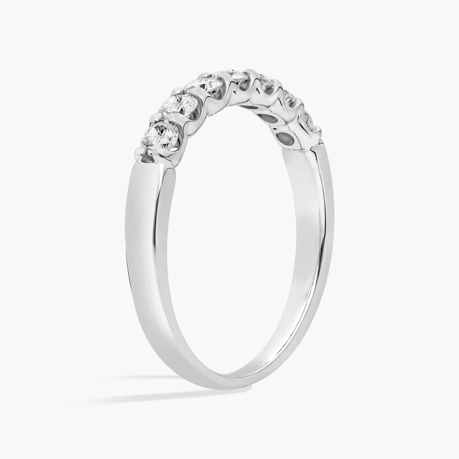 Семь выращенных в лаборатории бриллиантов в общих зубчатых оправах придают захватывающий блеск этому юбилейному кольцу. Оно отличается прекрасным блестящим дизайном из 14-каратного белого золота для непреходящей роскоши.