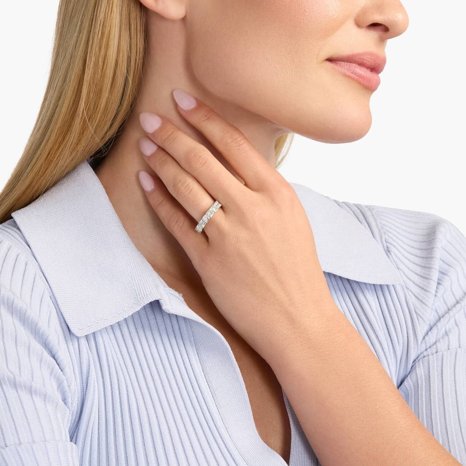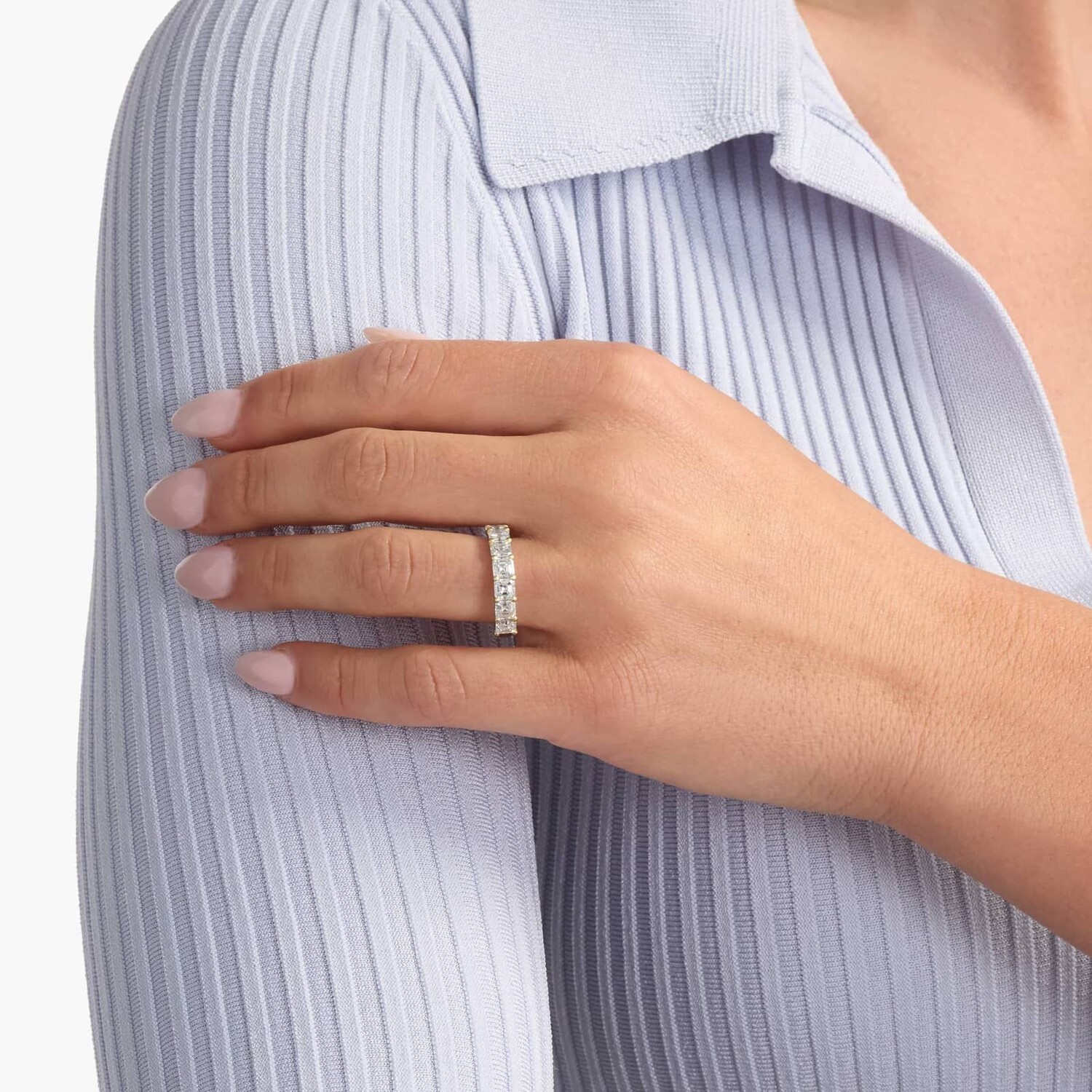 Это великолепное классическое кольцо с выращенными в лаборатории бриллиантами украшено семью блестящими бриллиантами огранки «Ашер», оправленными в прочное желтое золото 14 карат.