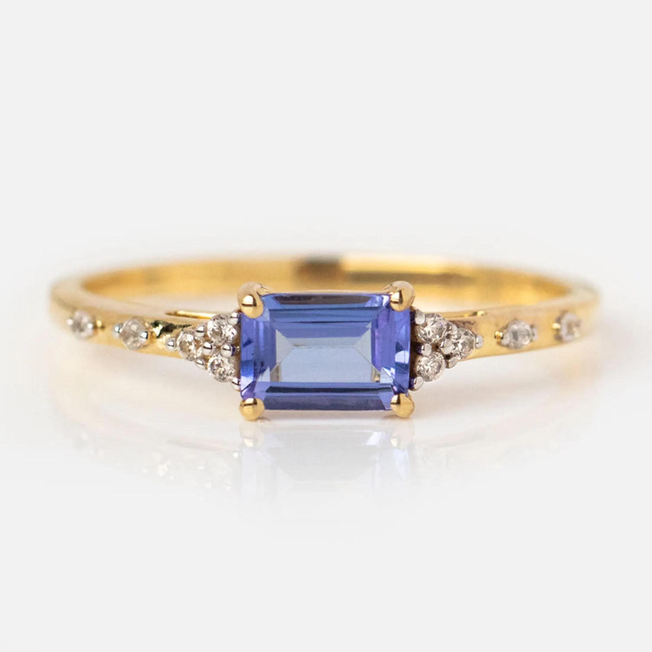 Кольцо с танзанитом багет с позолотой из желтого золота: Кольцо-стек из кубического циркония в стиле ар-деко: Восток запад Багетная огранка Драгоценные камни Ювелирные изделия Подарок для нее K
