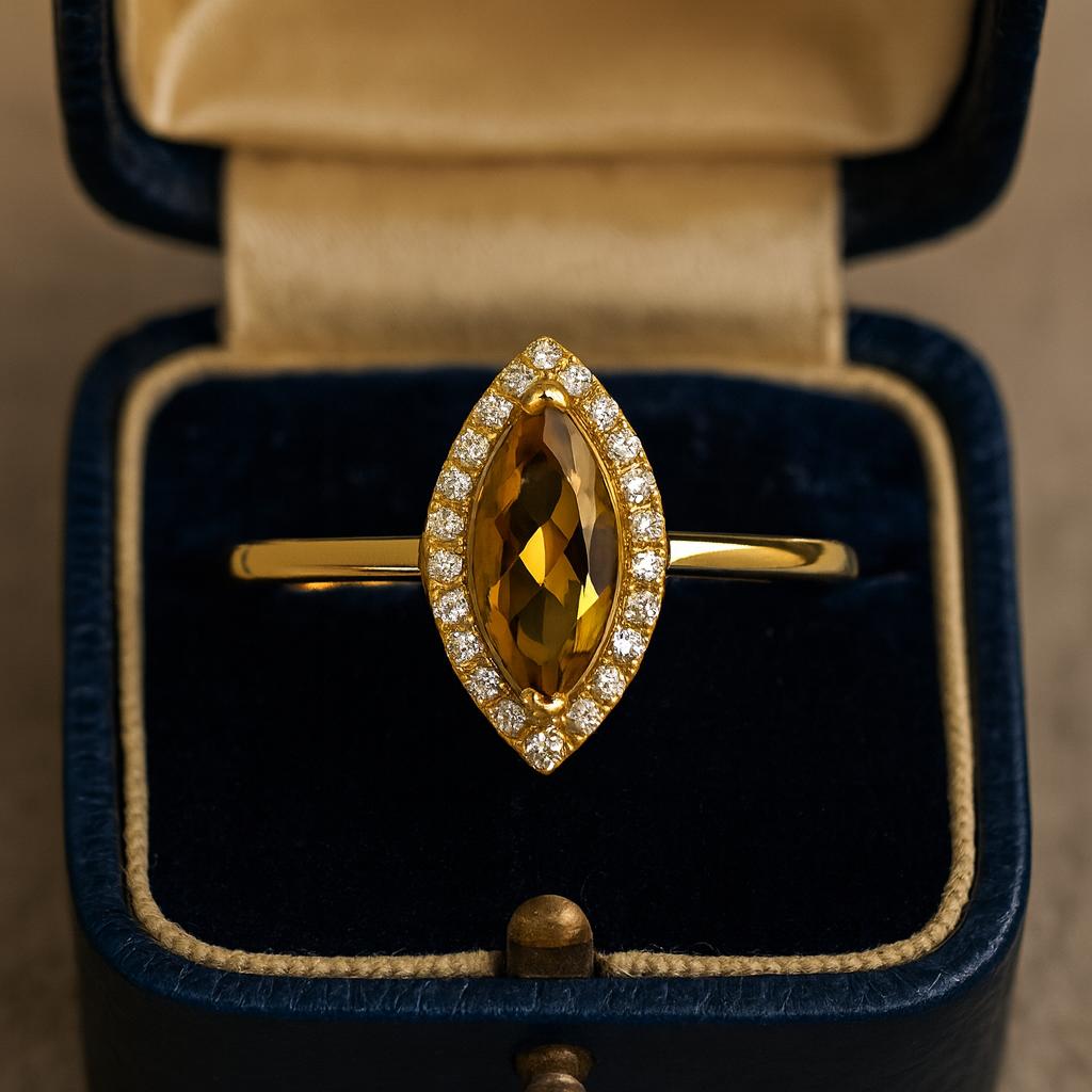 Кольцо с цитрином огранки «маркиза» в ореоле, серебряное украшение с позолотой из желтого золота, женское помолвочное и юбилейное кольцо Q золотой