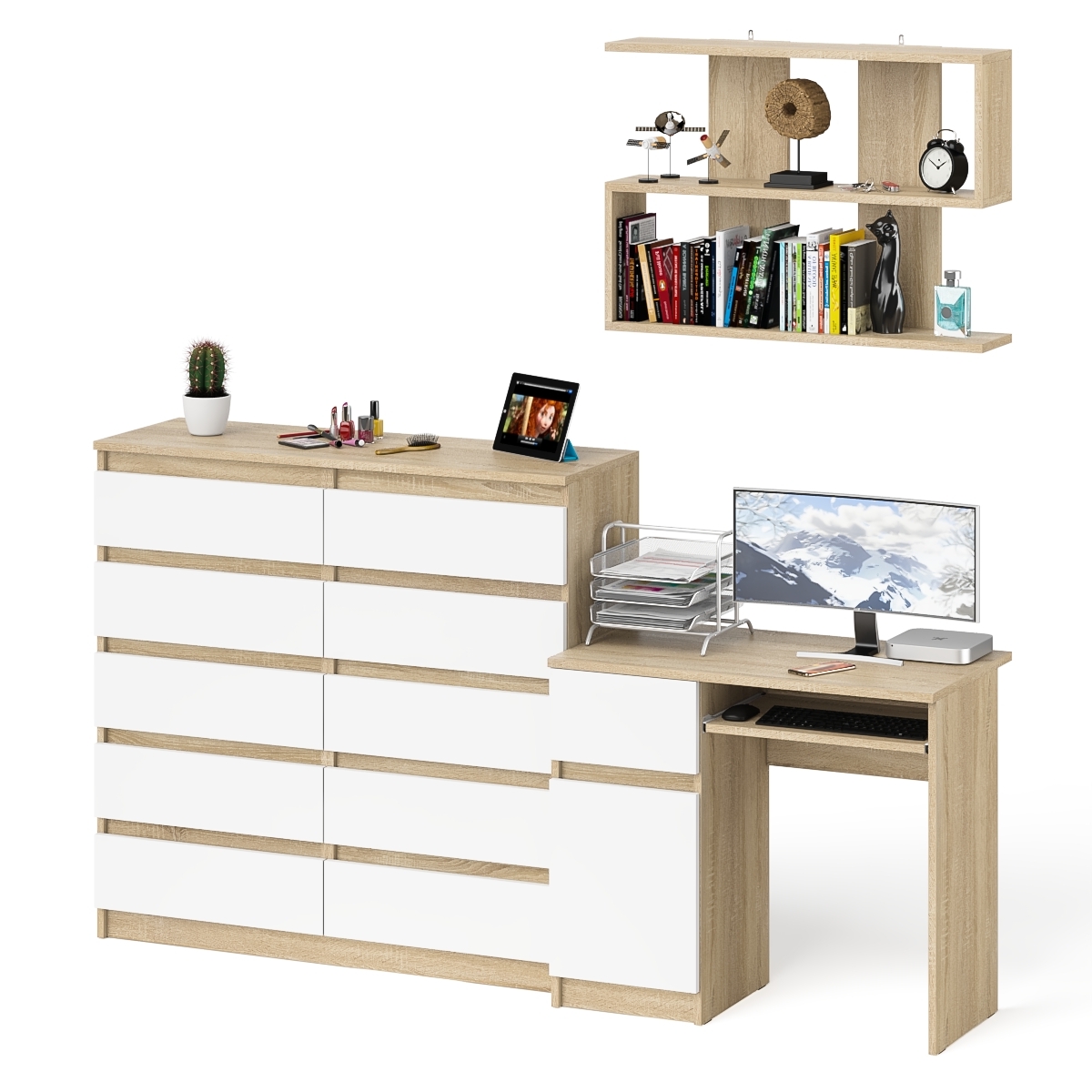 Комод 10 ящиков СВК Мори МК12.10 с компьютерным столом левый, дуб сонома/белый, МС-1Л+МК1200.10+Плк900-СБ