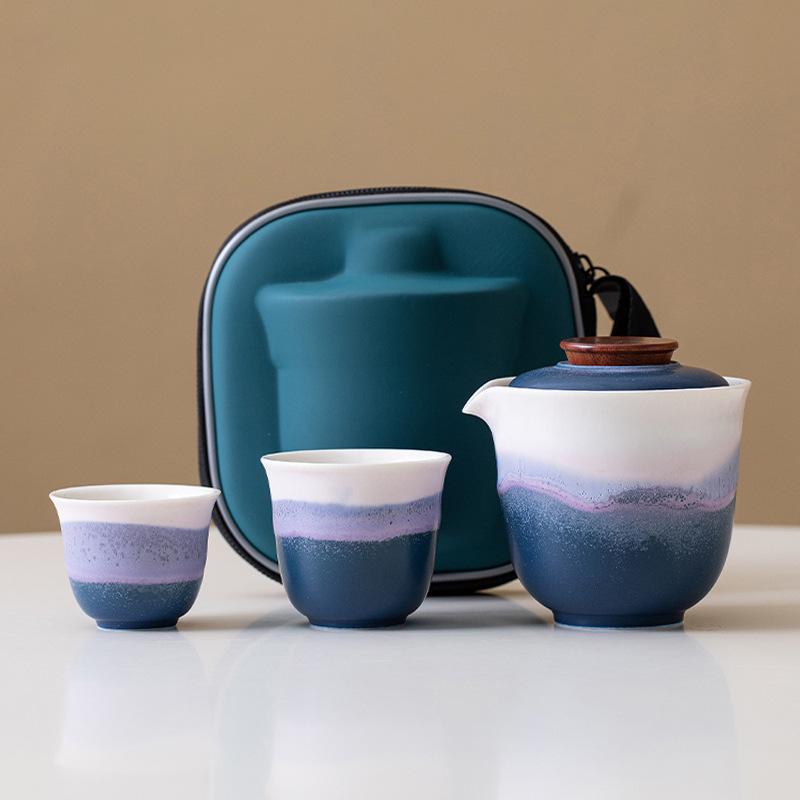 Компактный дорожный чайный набор для улицы - Портативный чайник и чайные чашки для личного пользования Kiln-Blue Teapot & 2 Cups + Bag