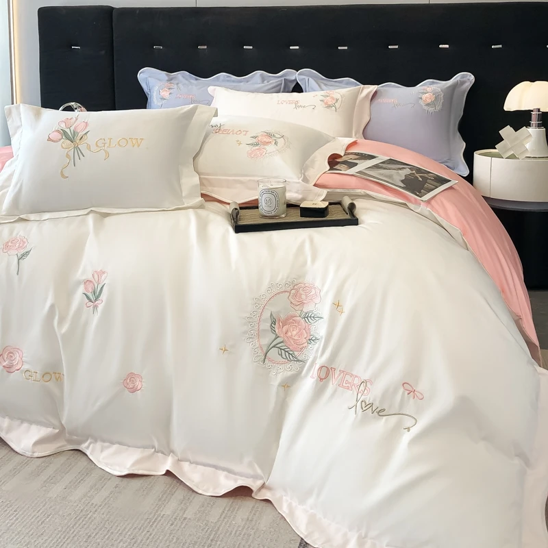 Комплекты постельного белья белого и розового цвета в стиле пэчворк, роскошный пододеяльник из 100% хлопка с цветочной вышивкой, простыня для кровати