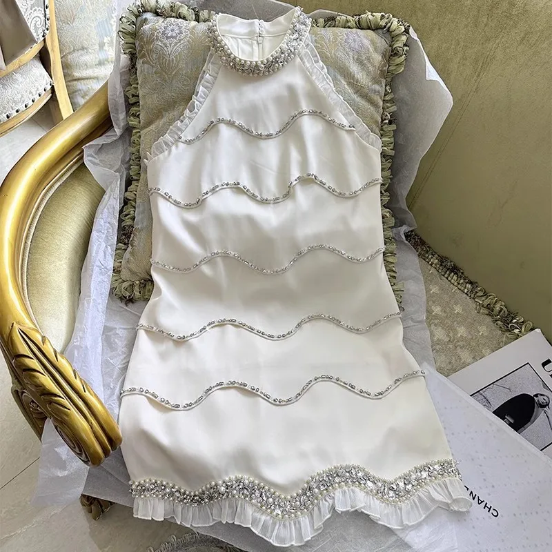 Женское Брендовое платье с оборками, подиумное белое вечернее платье без рукавов с подвесным воротником и бисером, дизайнерское платье, лет...
