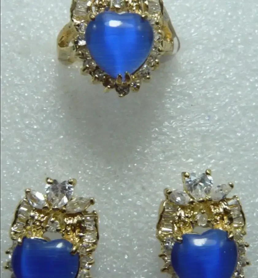Комплект из малайского нефрита в форме синего сердца, инкрустированный белым цирконом, металлические позолоченные серьги, кольцо, ювелирные изделия, подарок на День святого Валентина