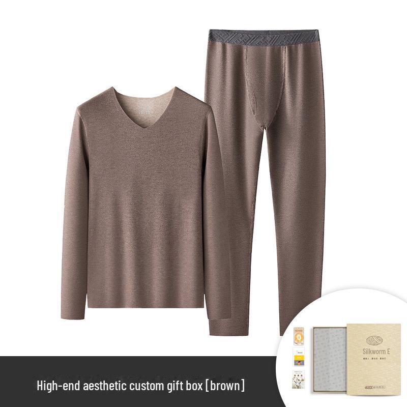 Комплект мужского термобелья: Шелковая шерсть, утолщенная, плюс бархат, однотонная, коллекция осень-зима 2XL (151-170 lbs) коричневый