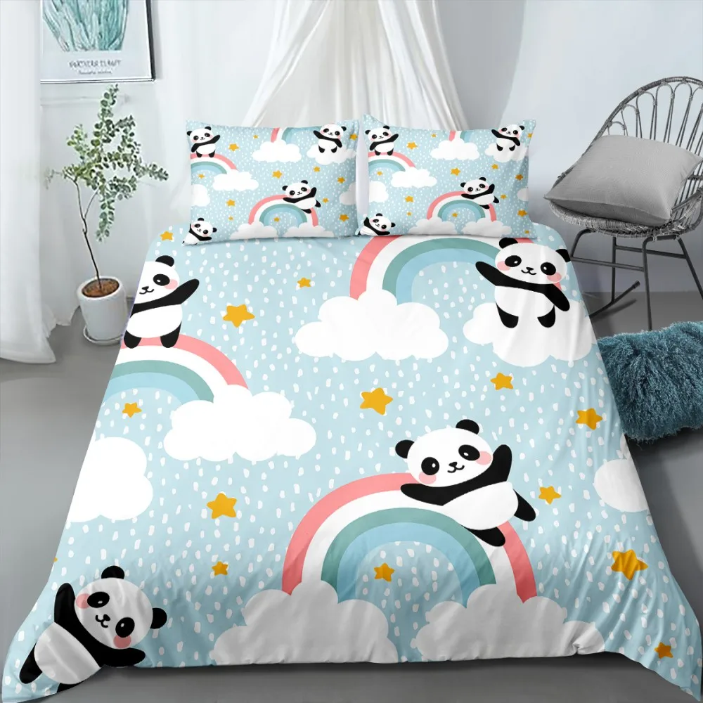 Комплект постельного белья из 2/3 предметов с красочными облаками и радугой, пододеяльник с мультяшными кошками и пандой для детей и взрослы...
