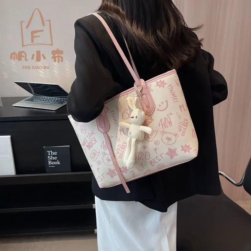 Large capacity luxury handbag for women 2024 fashion high-end graffiti tote bag cute bear pendant shoulder bag student schoolbag