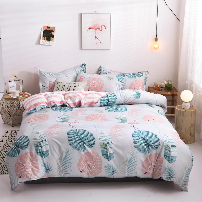 Комплект постельного белья с принтом фламинго, в полоску, пододеяльник с листьями, простыня, двуспальное стеганое одеяло, односпальное покр...