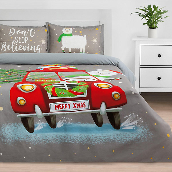 Комплект выполнен в новогодней стилистике. Подойдет для полуторной и двухспальной кровати. Качественный материал легко поддается глажке. Рисунок нанесен безопасными красителями. Комплект легко надевать на одеяло и подушку.