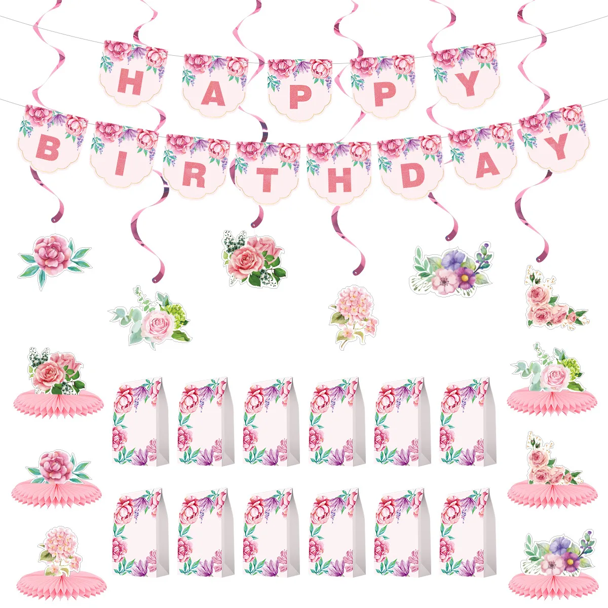 SURSURPIRSE Pink Flowers Happy Birthday Banner Candy Gift Bag Honeycomb Balloon Hanging Swirl for Women Birthday Party Supplies