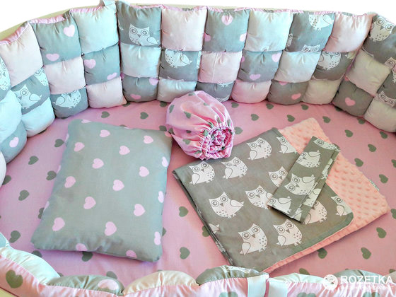 Комплект Бисквитная мягкость Розовый с сердцами и совами 6-в-1В комплект входит:Бортик: 2 длинных и 2 коротких части на лентахПростынь на резинке для круглой/овальной люльки с размерами спального места 72х72 см / 60х71 см (при условии, что высота матраса не превышает 7 см)Простынь на резинке для овальной кроватки с размерами спального места 72х120 см / 60х120 см (при условии, что высота матраса не превышает 7 см)Плед-конверт с плюшем минки и хлопковой тканью 75х75 смПояс на выпискуПодушка: 30х40 смНаволочка 30 х 40 смСостав ткани: 100% хлопокНаполнители: синтепон, холлофайбер первого сортаЛенты белые репсовые