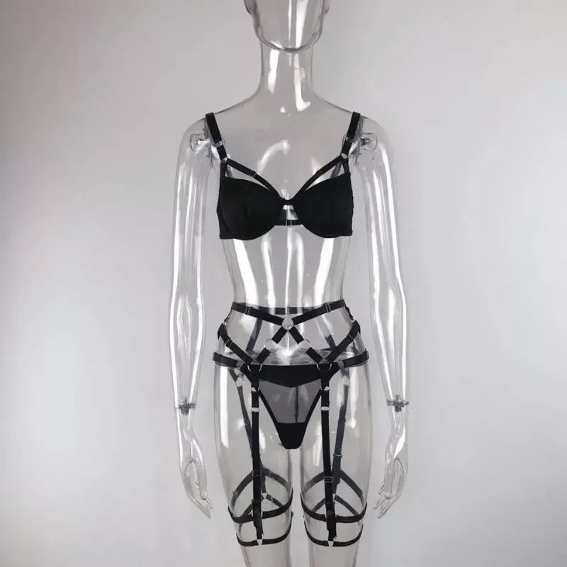 Комплект сексуального женского нижнего белья из трех предметов, бюстгальтер с вырезами + стринги + кольцо для повязки, пояс для чулок, компле...