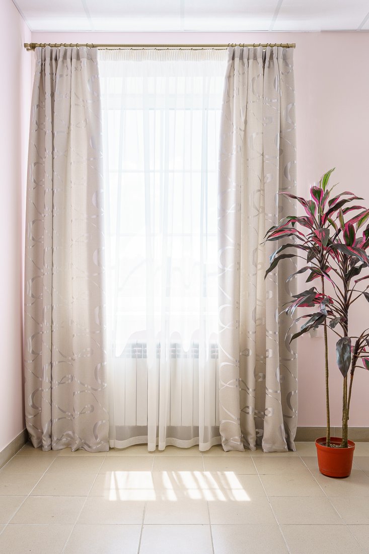 375 х 250 см, рогожка, для жилой комнаты, серый/бежевый, крепление тесьма, пропускают свет