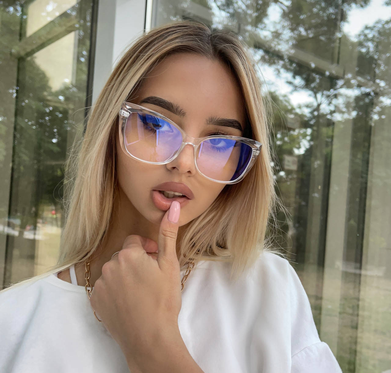 Женские компьютерные очки формы Кошка в пластиковой прозрачной оправе и компьютерными линзами Blue Blocker . Линзы Blue Blocker блокируют вредное ультрафиолетовое и электромагнитное излучение от мониторов компьютера , дисплеев смартфонов , экранов телевизоров . Такие линзы снижают нагрузку на глаза , предотвращают покраснение глаз , снижают усталость , а самое главное - это предотвращают появление болезни глаз под названием " Компьютерный синдром " .