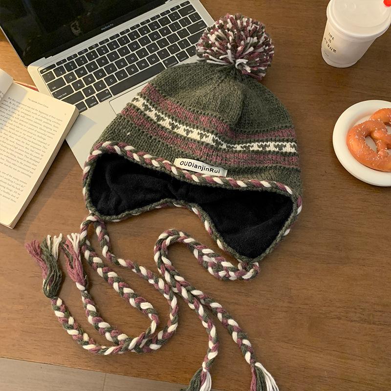 Контрастная цветная шапка-коса с помпоном, женская осенне-зимняя теплая универсальная, для маленького лица, с защитой ушей M(54-58cm) зелёный