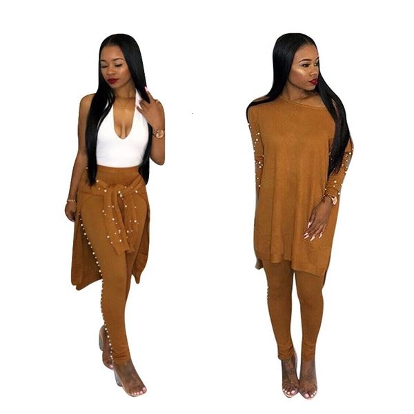 осень зима женщины вязать брюки набор жемчужина из двух частей набор длинный бисероплетение свитер пуловер брюки повседневная женщины спорти, White