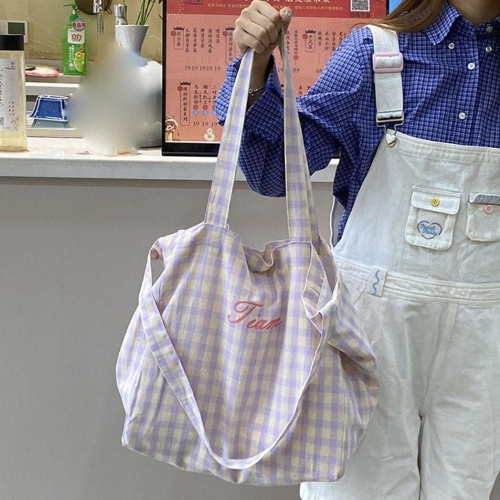 Конфетный цвет клетчатая сумка через плечо с надписью Большая вместимость сумка кроссбоди Простая холщовая сумка-тоут для девочек фиолетовый