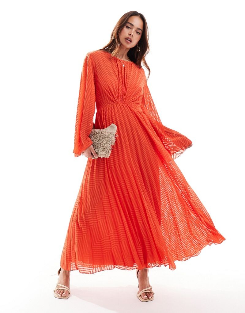 Коралловое шифоновое платье миди со складками и шевронным принтом ASOS DESIGN с завязками на спине и рифлеными рукавами