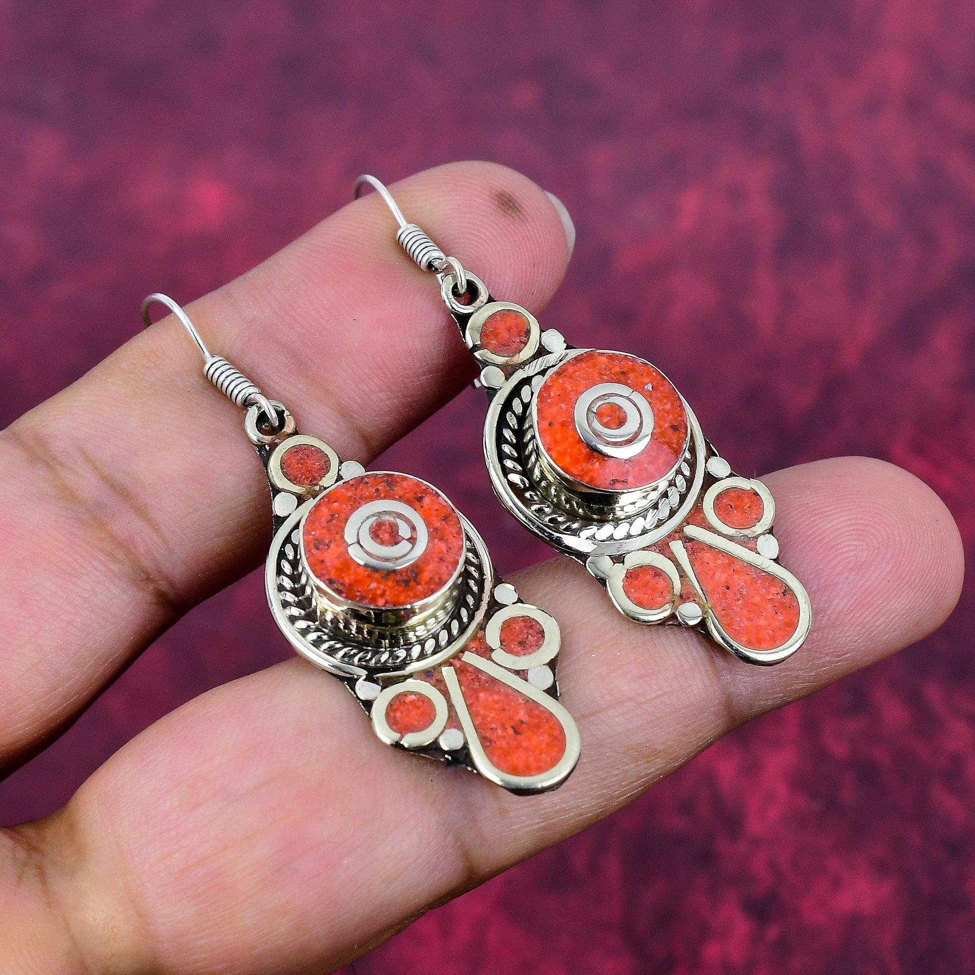 Коралловые серьги из цельного стерлингового серебра 925 пробы в непальском стиле, Ювелирные изделия с драгоценными камнями ручной работы, Подарки для жены, Совершенно новые серьги 2.16 Inches