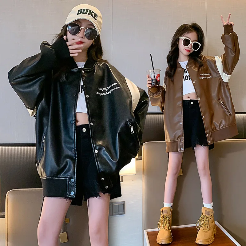 Корейская версия для девочек, бейсбольная куртка в стиле пэчворк, кожаная куртка, осень/зима 2023, свободная и приталенная яркая куртка, трендовая куртка