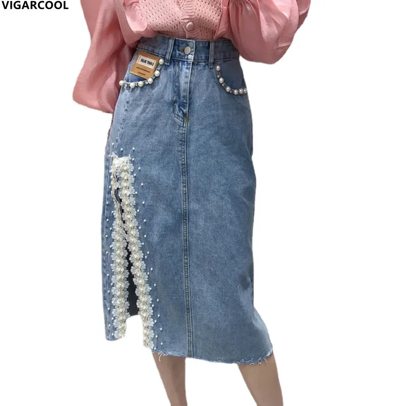 Корейская версия, модная Тяжелая промышленная джинсовая юбка с жемчужными кружевами и разрезом, новая женская летняя Облегающая джинсовая ...