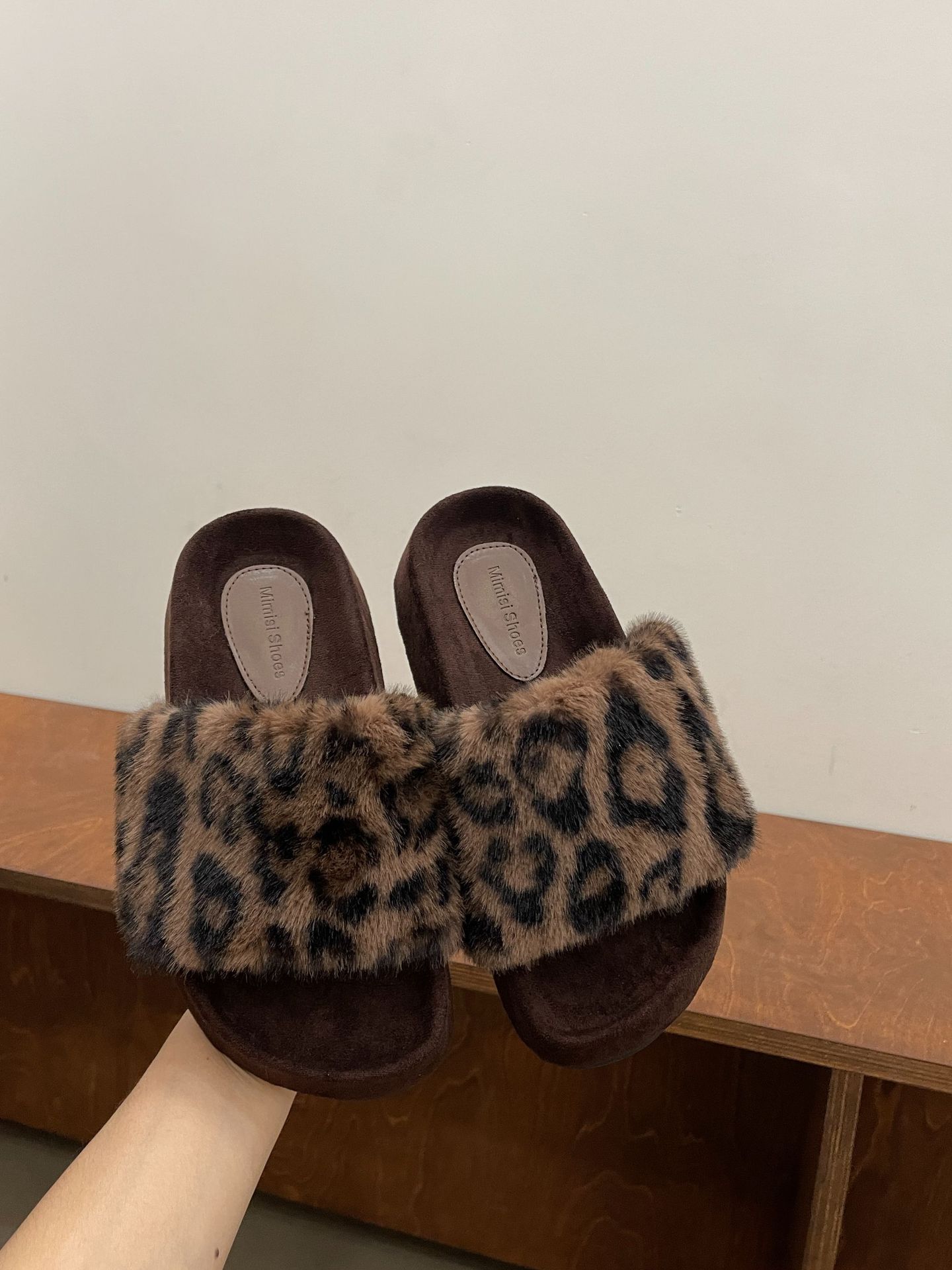 Корейская версия норковых пушистых туфель с мягким характером шлепанцы на одной подошве зимние новые с открытым носком на толстой подошве хлопковые тапочки для дома теплые сандалии 39 цветной печати леопарда