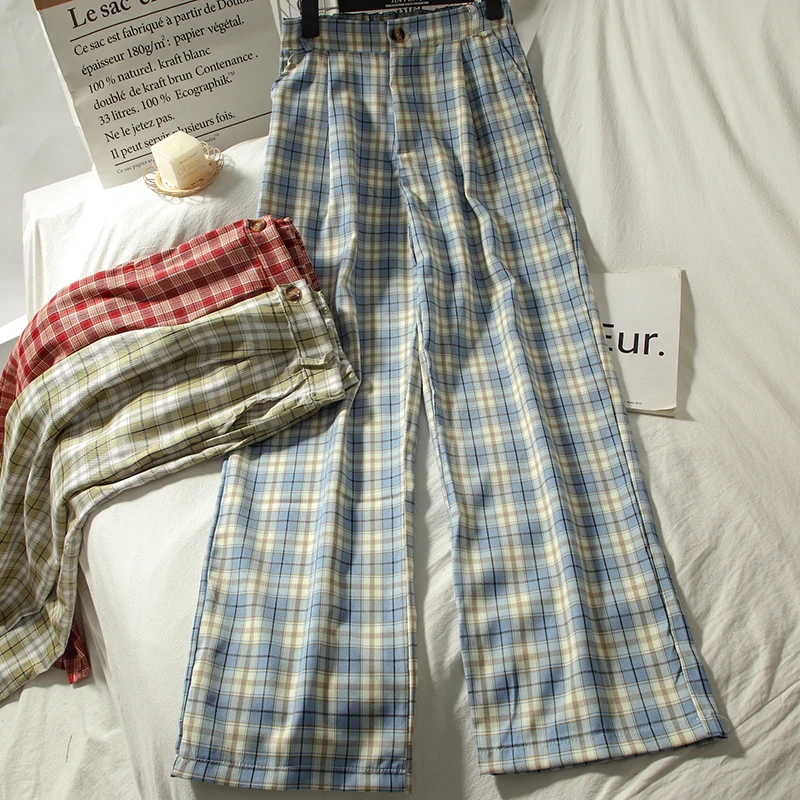 Корейская версия, с высокой талией, прямые, широкие брюки, клетчатые, повседневные, женские штаны, летние, вертикальные, Осенние, стильные, то...