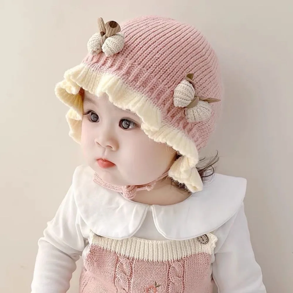 Корейская детская вязаная шапка с рюшами, зимняя теплая защитная шапка для ушей для малышей, милые однотонные детские шапки с бантом на шнуровке, детские шапки