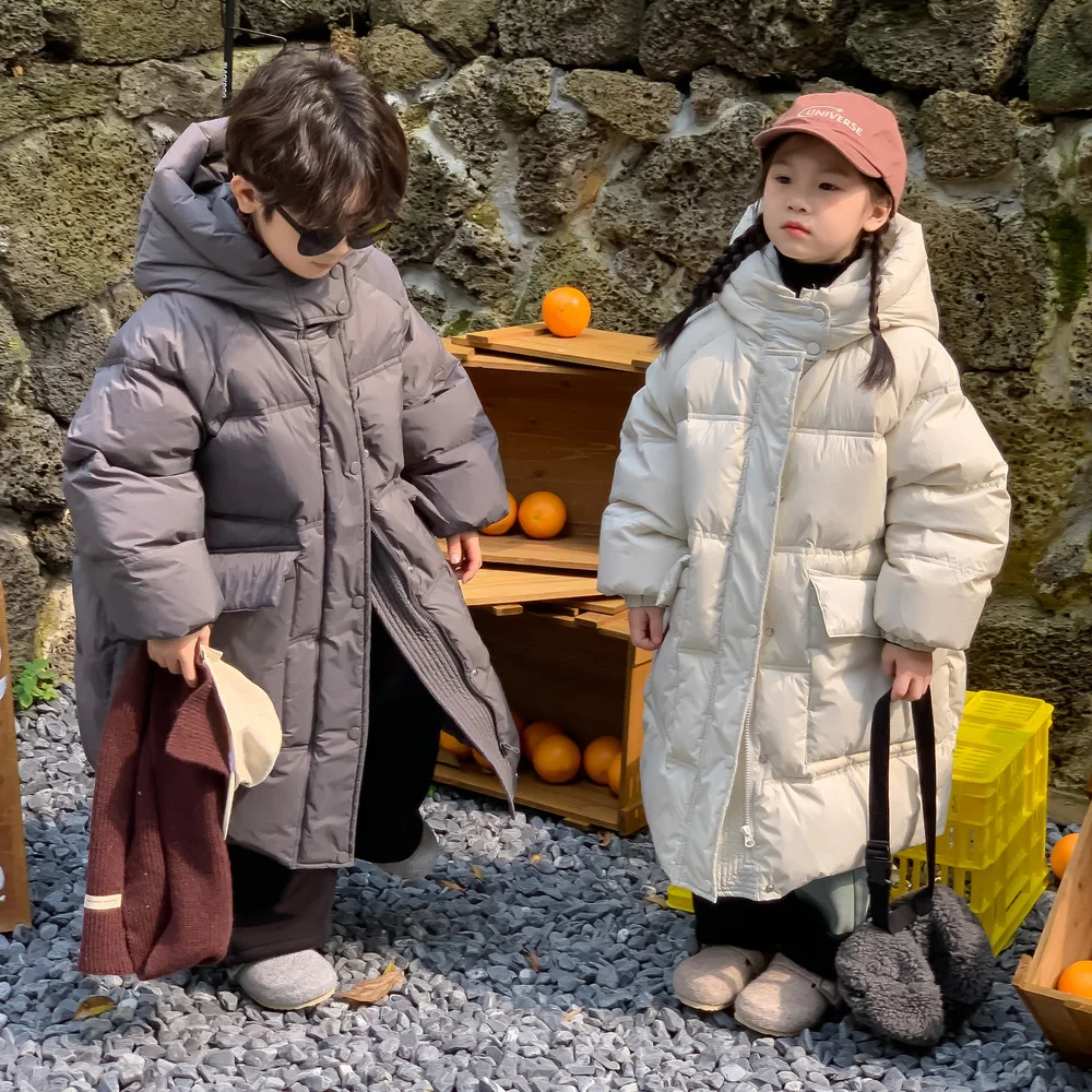 Корейская зимняя куртка на утином пуху для девочек от 1 до 10 лет, утепленная детская длинная верхняя одежда с капюшоном для девочек, парки, ветрозащитное пальто для девочек-подростков