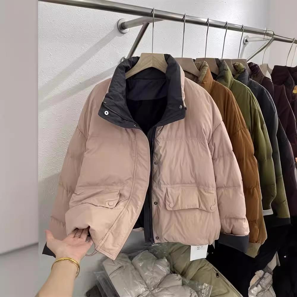 Корейская контрастная цветная прямая куртка-пуховик с воротником-стойкой, женская короткая, зимняя новая куртка из белого утиного пуха 2024 года, студенческая куртка average size розовый