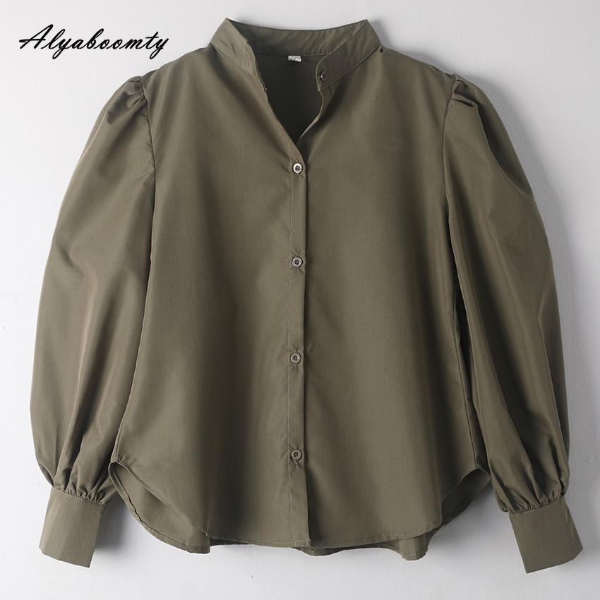 Корейская мода Весна Осень Женская повседневная блузка Воротник-стойка Однотонная Уличная рубашка Пышный рукав Свободная Стильная женская блузка ONE SIZE