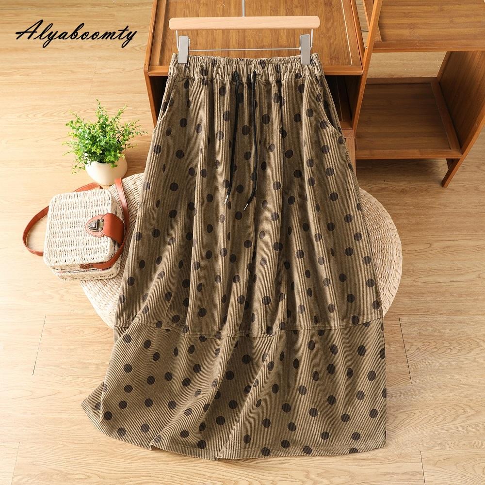 Корейская мода Осень Зима Женская юбка миди с высокой талией в горошек Вельветовая юбка Винтажная юбка А-силуэта на кулиске с карманами One Size дубильная кора