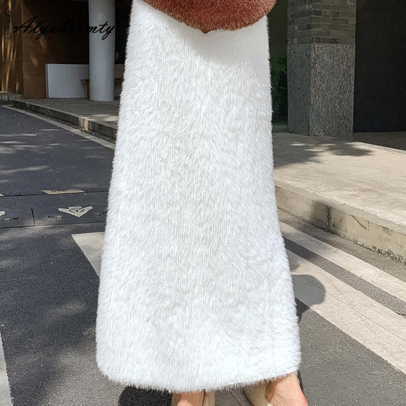 Корейская мода осень-зима женская длинная юбка трапециевидной формы с высокой талией белый абрикосовый серый черный хаки юбка из искусственного меха элегантная женская офисная пышная юбка One Size