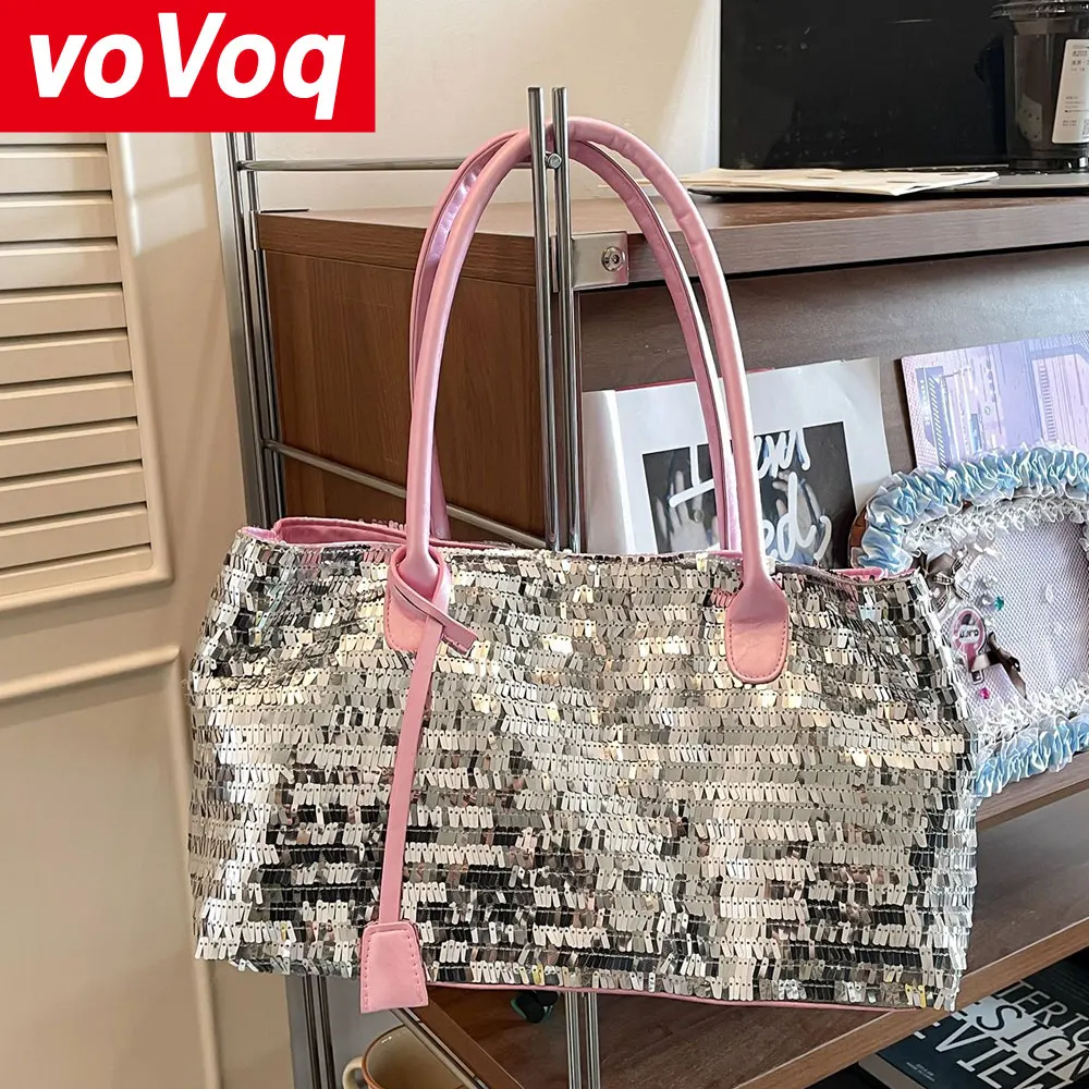 Корейская модная сумка через плечо для девочек с блестками, большая вместимость, изысканная и милая розовая серебряная большая сумка
