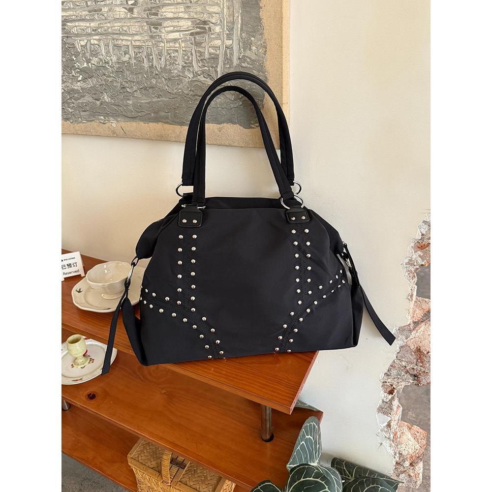 Корейская нейлоновая сумка-тоут с заклепками высокого класса, новая большая вместительная сумка в стиле пустоши, ретро простая сумка на плечо чёрный