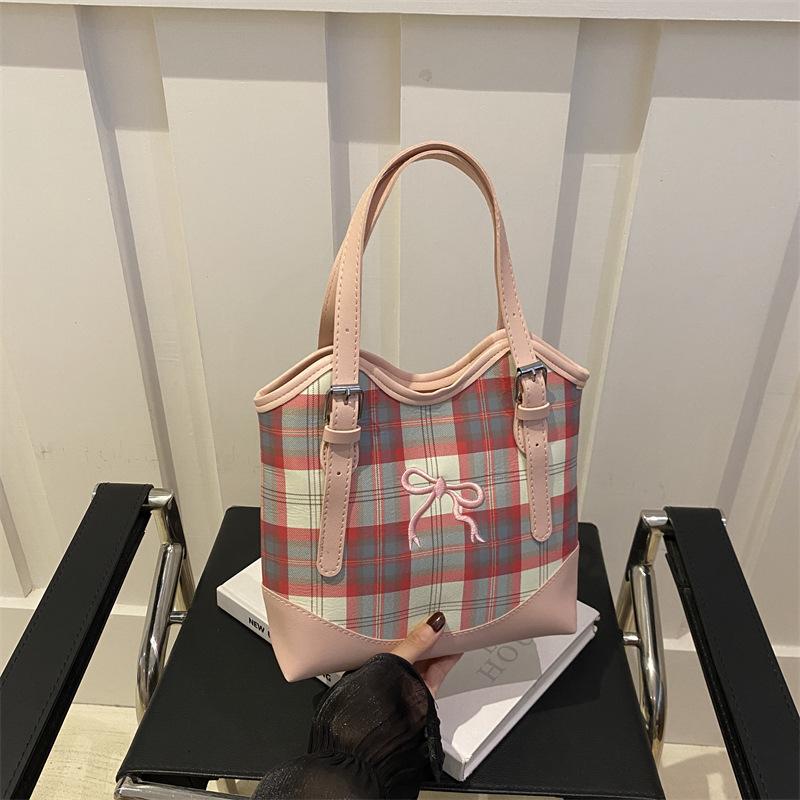 Корейская нишевая клетчатая сумка большой вместимости женская 2025 новая модная сумка-тоут универсальная наплечная сумка розовый