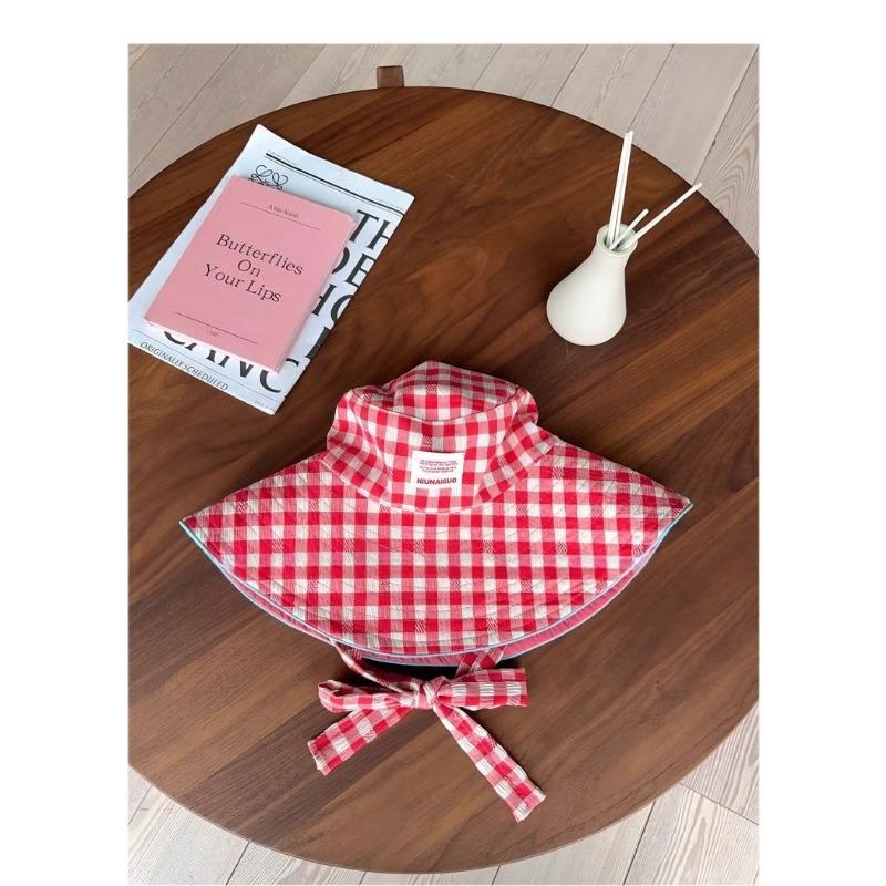 Корейская панама в клетку с ремешком для женщин на лето, с широкими полями, подчеркивающая лицо, маленькая, для защиты от солнца, шляпа от солнца, шляпа-ведро с двойным дном для большой головы, нет M(56-58cm)