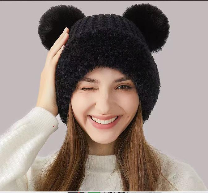 Корейская ретро-шапка из толстой шерсти с плюшевыми наушниками и милым помпоном Plush knitted bear чёрный