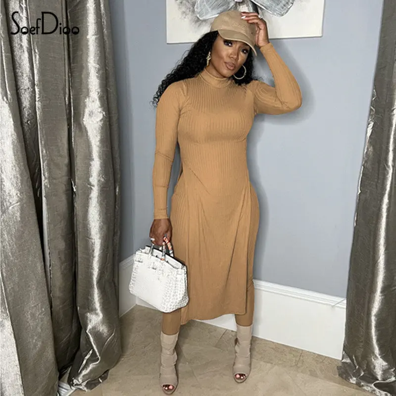 Soefdioo Solid Ribbed Round Neck Full Sleeve Slit Long Tops and Pencil Pants Two Piece Sets Womens Outfits Fall 2022 Streetwear