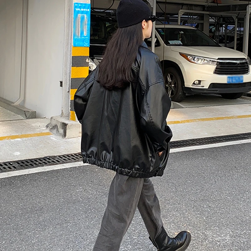Корейская черная кожаная куртка, женская зимняя длинная мотоциклетная байкерская куртка на молнии, уличная одежда в стиле Харадзюку Y2K, сво...