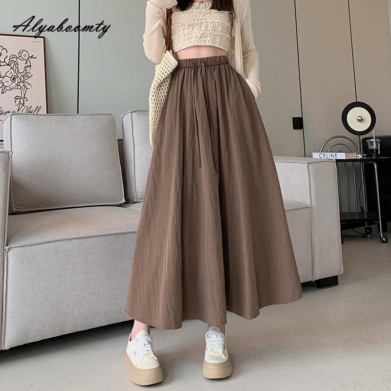 Корейский стиль, весна-лето, женская юбка-миди с высокой талией, на шнуровке, черные, кофейные, элегантные женские юбки с карманами One Size коричневый